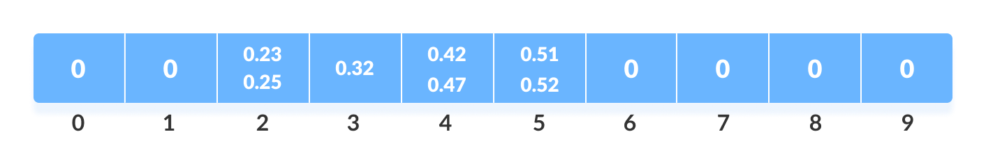 Suppose, an input element is.23is taken. It is multiplied bysize = 10(ie..23*10=2.3). Then, it is converted into an integer (ie.2.3≈2). Finally, .23 is inserted into bucket-2.