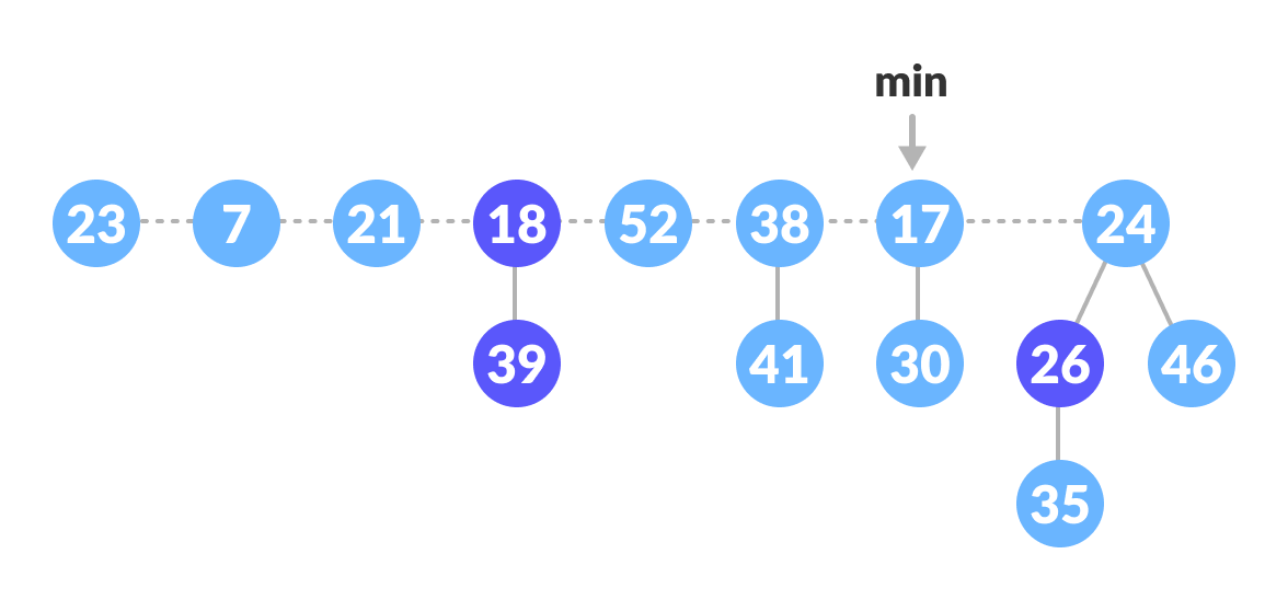 The roots of all the trees are linked together for faster access. The child nodes of a parent node are connected to each other through a circular doubly linked list as shown below.